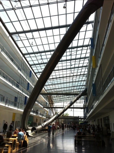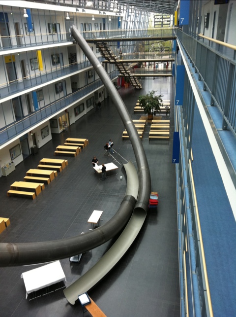 Ez pedig belülröl. A nagy csö, egy csuszda a harmadikról egész a földszintre. Elég tériszonyos odafent, föleg a lépcsö a hidakkal, az egész mozog ahogy mennek rajta az emberek. Na ki találja el hol van a robotika tanszék?:)