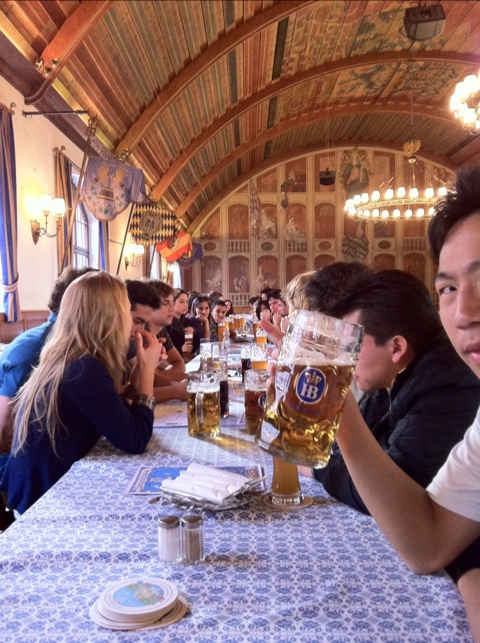 A Hofbräuhaust már ismertem el?tte is, a 7,30€ sörével együtt:). Aranyosak voltak a többiek, fogalmuk sem volt hogy itt a sör az maßban méretik, így igen kikerekedett szemmel néztek amikor kihozták a literes korsókat amiket rendeltek:). A legaranyosabb az iráni lány volt, aki azt mondta hogy ivott már alkoholt, de csak otthon, hogy ne lássa senki. Na ? egész végig a sörét fényképezgette minden létez? szemszögb?l:). A hangulat elég meredeken kezdett emelkedni, így jobbnak láttam ha olajra lépek, túl nagy volt a kísértés. Arról nem is beszélve, hogy a haza utam is igencsak idöigényes.